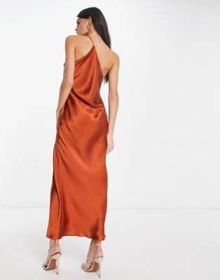 ASOS DESIGN – Wadenlanges Satinkleid in Rostrot mit One-Shoulder-Träger und drapierter Rückseite