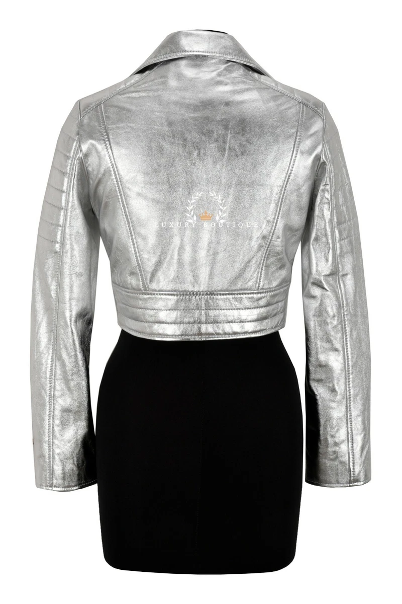 Missy Damen kurz geschnittene Lederjacke Metallic Silber Napa modische Jacke