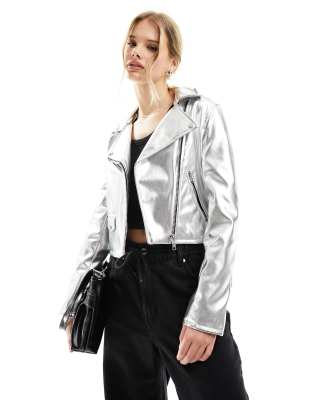 Bershka – Biker-Jacke in Metallic-Silber