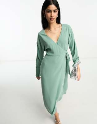 ASOS DESIGN – Midi-Wickelkleid mit Schnürung an den Bündchen in Salbeigrün